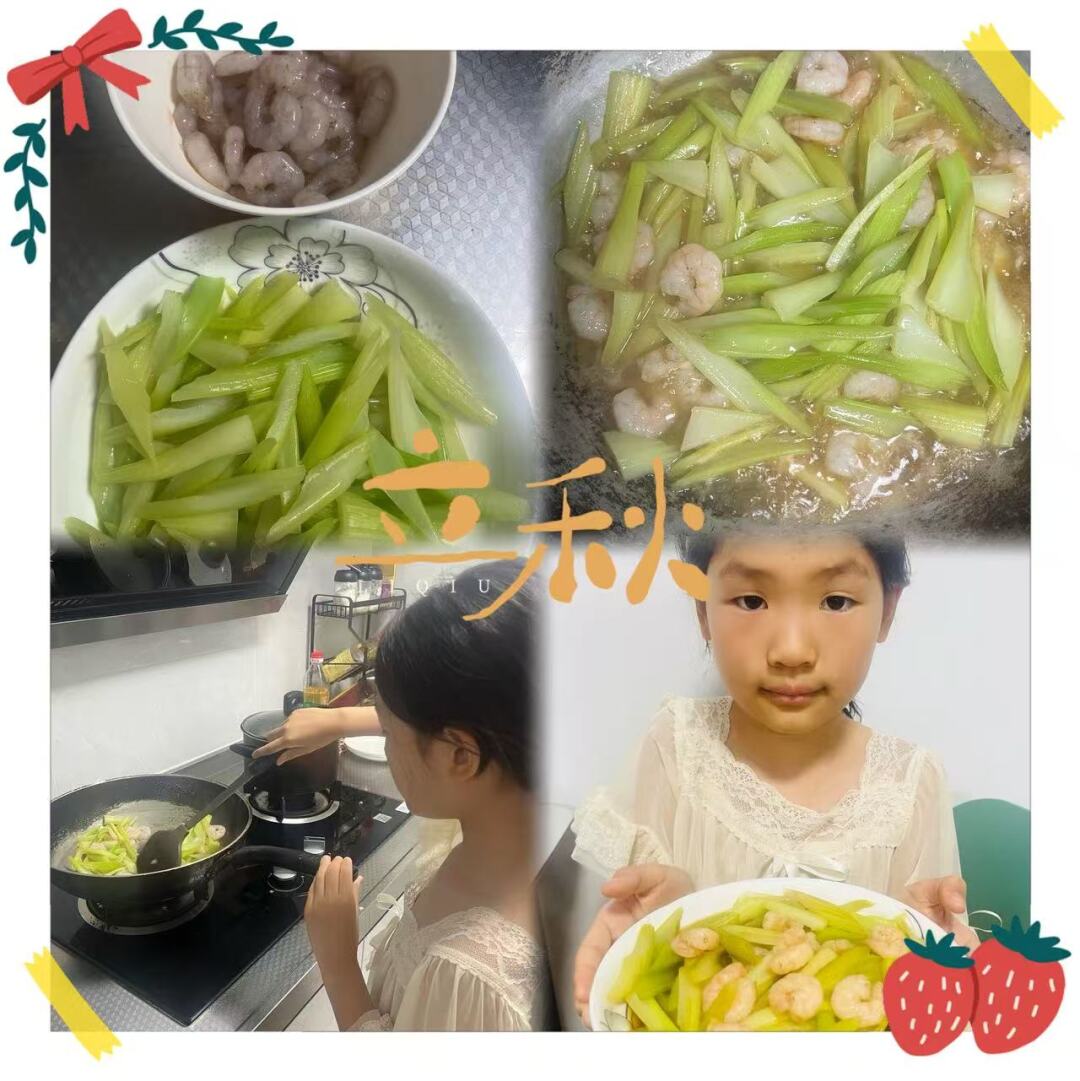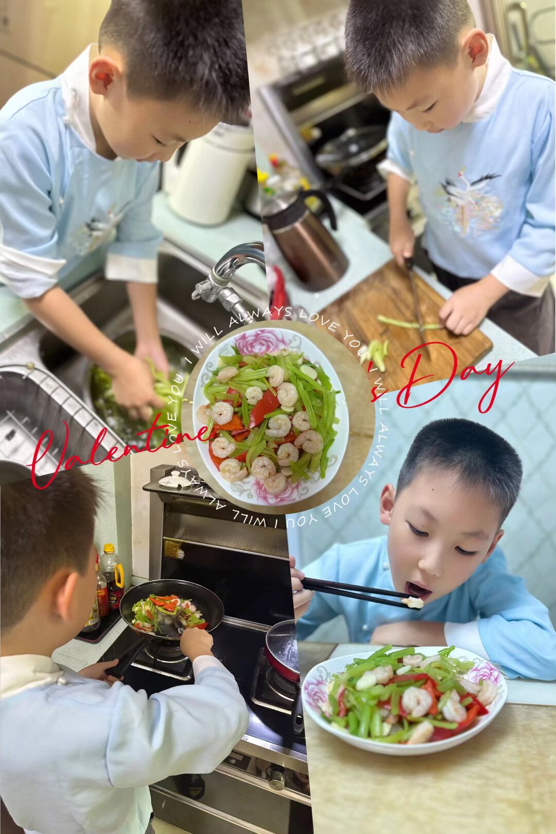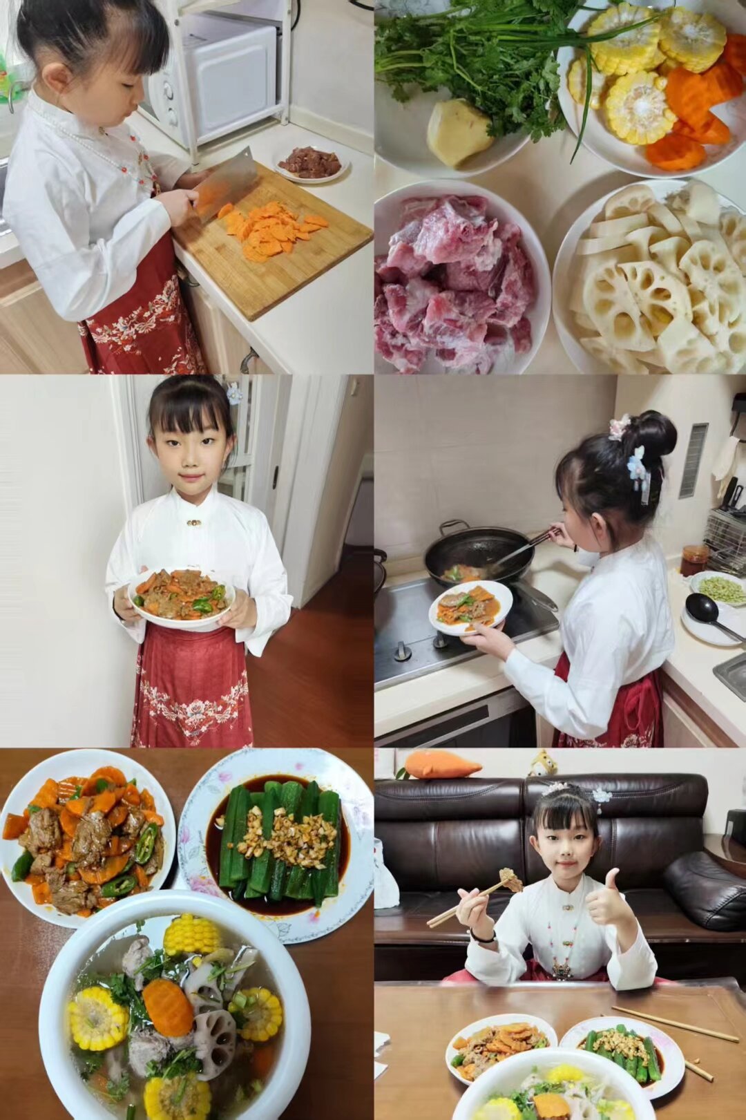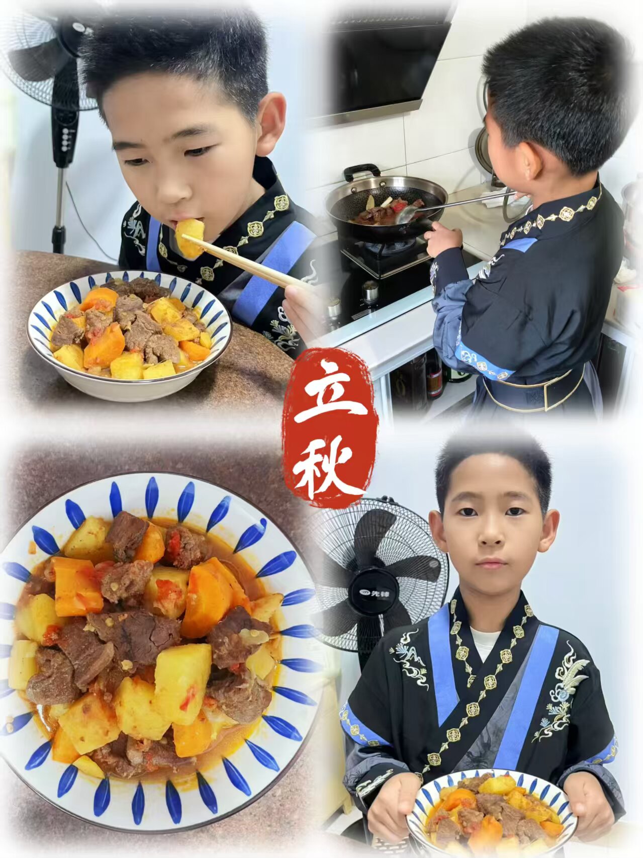 活动中,同学们走进家庭厨房,大家化身“小厨神”,在家长指导下,围绕“贴秋膘”的营养需求,精心搭配食材、动手烹制秋菜:有的将粉糯莲藕与鲜嫩排骨同炖,熬出汤色奶白的莲藕排骨汤;有的以脆嫩西芹搭配Q弹虾仁,快炒出清爽鲜美的西芹炒虾仁;还有的用软糯土豆搭配酱香牛肉,焖煮出香而不腻的土豆烧牛肉。切菜、翻炒、调味,动作虽显稚嫩却格外认真,厨房中飘出的阵阵鲜香,正是秋味与成长的味道。