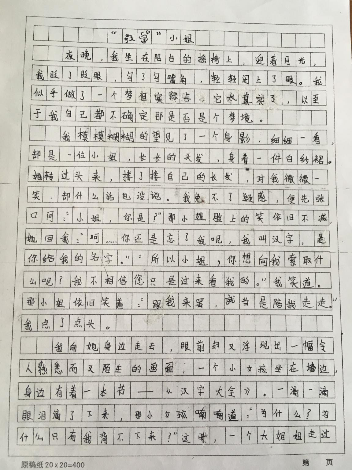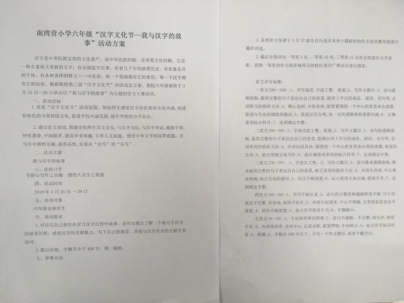 它是中华民族宝贵的文化遗产,是人民智慧的结晶;它最早由甲骨文演化而来,拥有六千多年的历史;它是我们生活中必要的组成部分,有它的地方就会不一样……它是什么呢?它就是汉字。2019年3月28日——4月3日我校六年级根据“第三届汉字文化节”的活动总方案举办了以“我与汉字的故事”为主题的征文大赛活动。