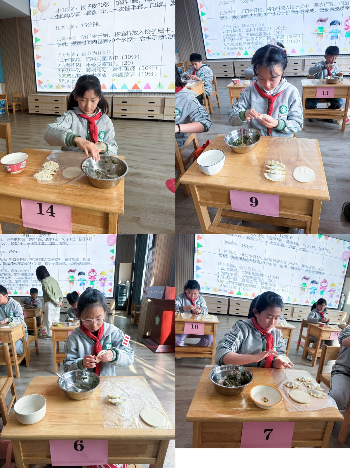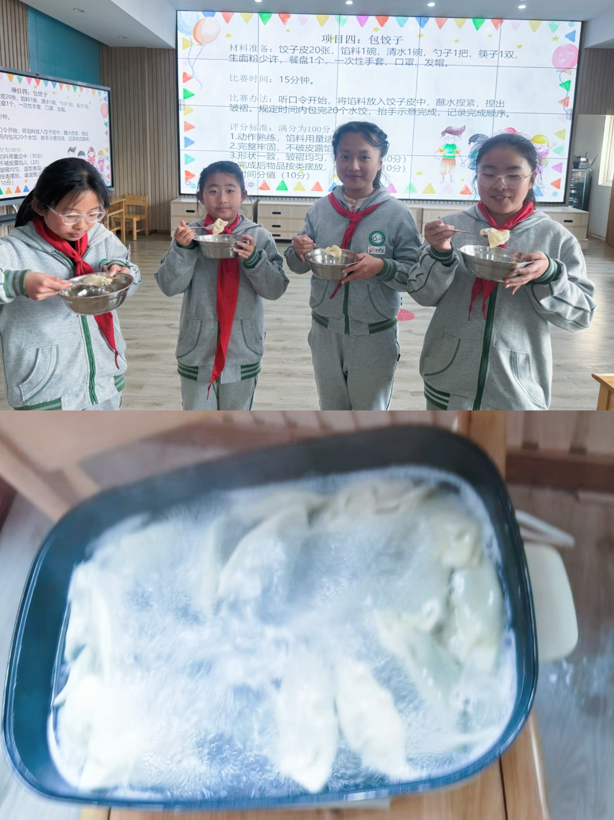 第四项包饺子,孩子们熟练地拿起饺子皮,挖一勺馅料放入其中,随后手指灵动地捏出饺子褶。不一会儿,形态各异的饺子摆满了案板,有的圆润饱满,有的小巧精致,充分展现出孩子们的动手能力和创造力。最后,将包好的饺子煮给学生品尝,每个人都吃得津津有味,大家都觉得自己亲手包的饺子就是最好吃的。