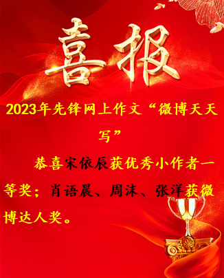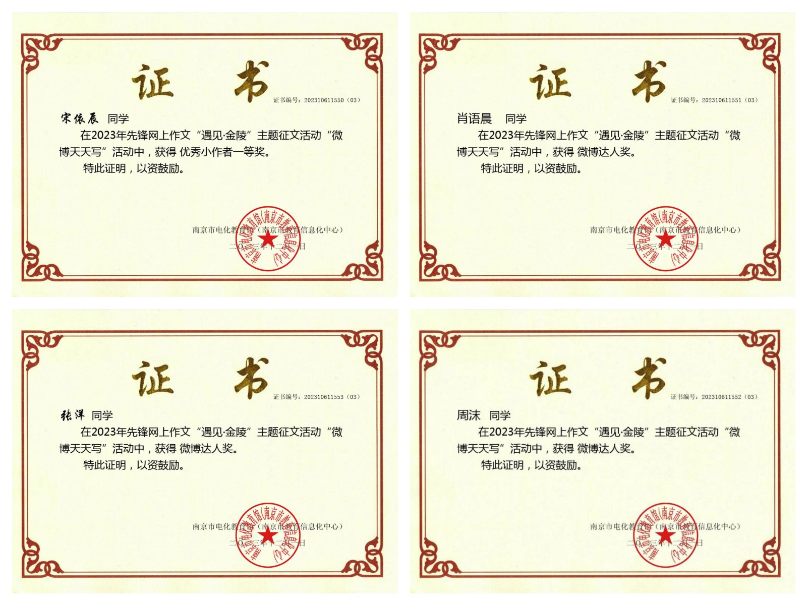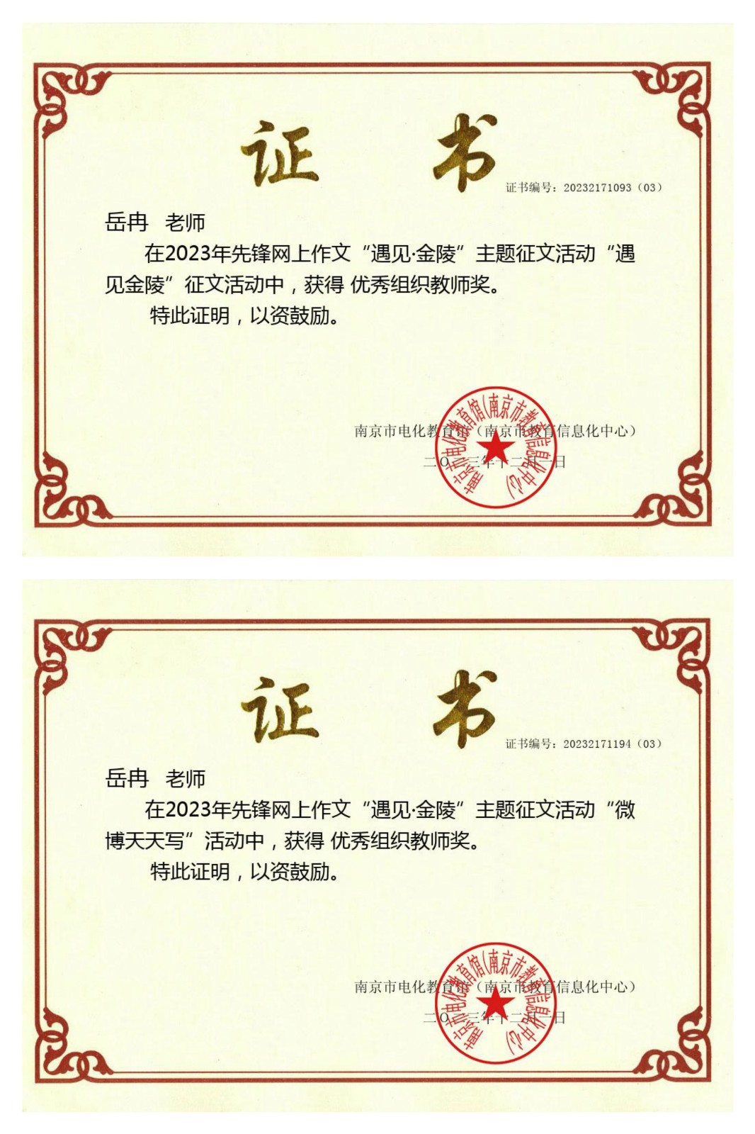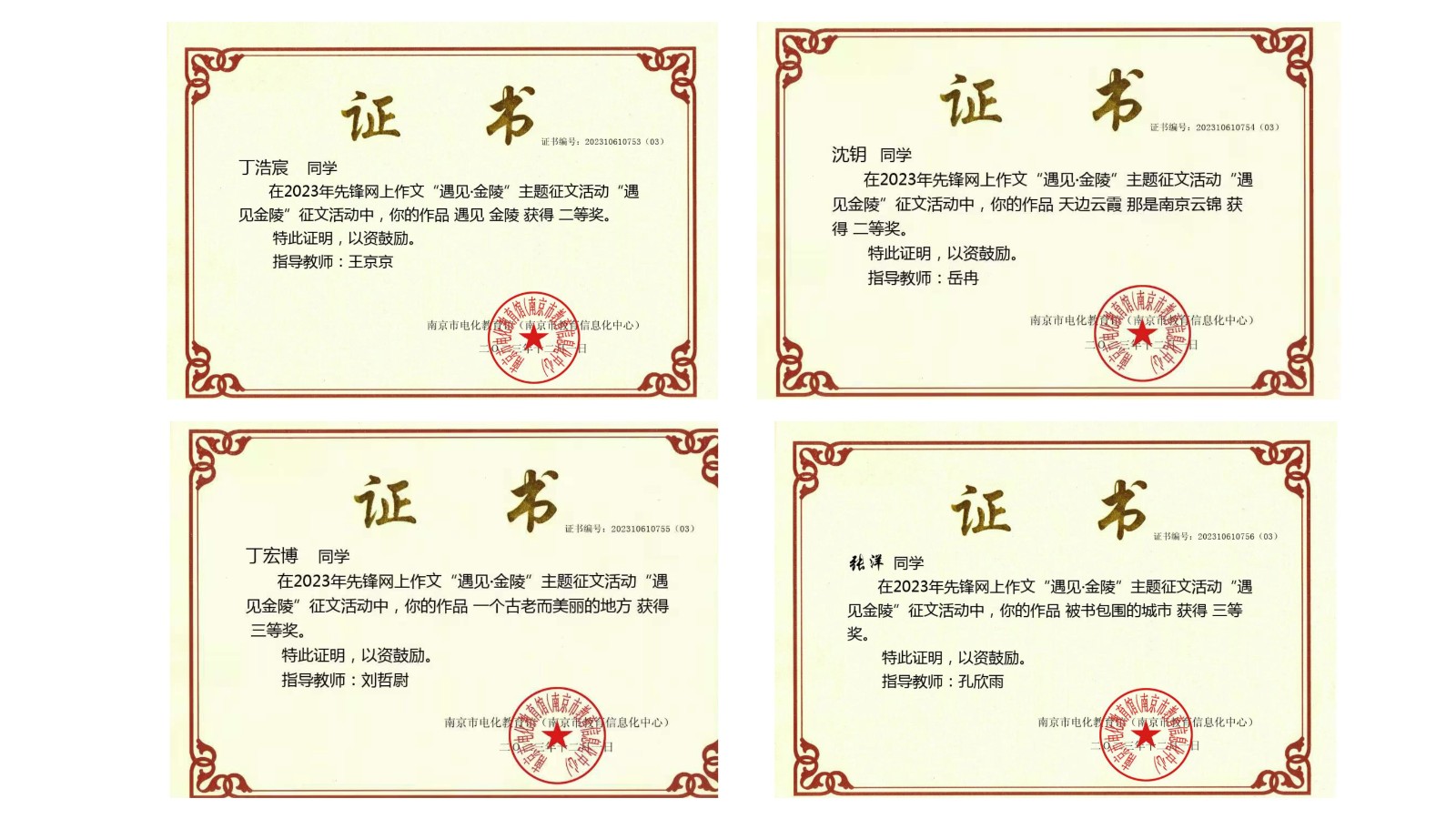 在南京市电化教育馆(南京市教育信息化中心)组织2023年先锋网上作文“遇见·金陵”主题征文活动“遇见·金陵”主题征文和“微博天天写”活动中,我校共8名学生获奖,岳冉老师分别获“遇见·金陵”主题征文和“微博天天写”活动的优秀组织教师。获奖名单如下: