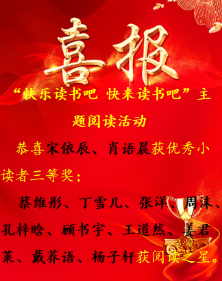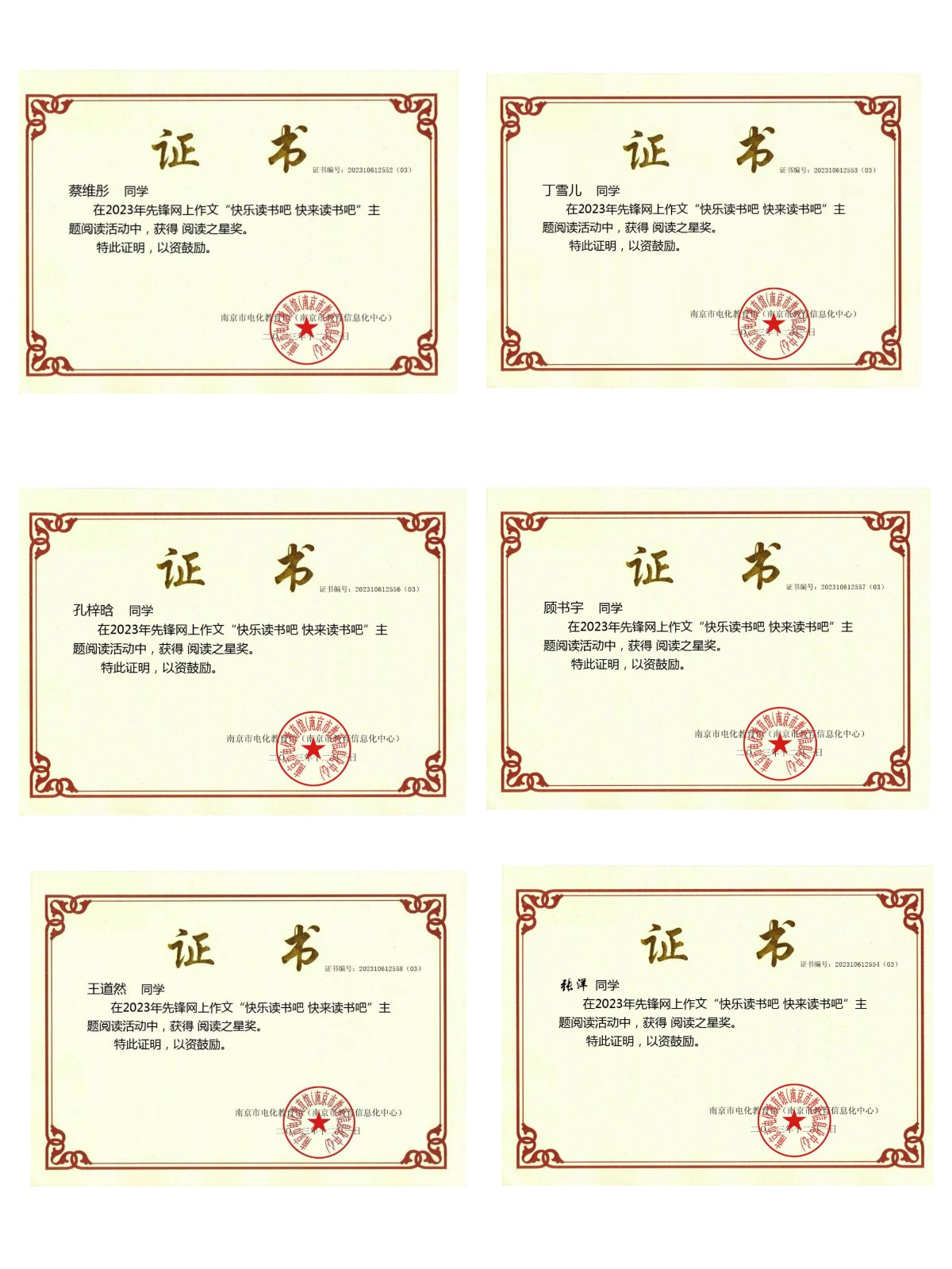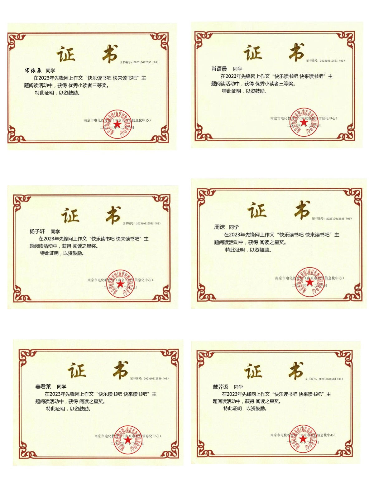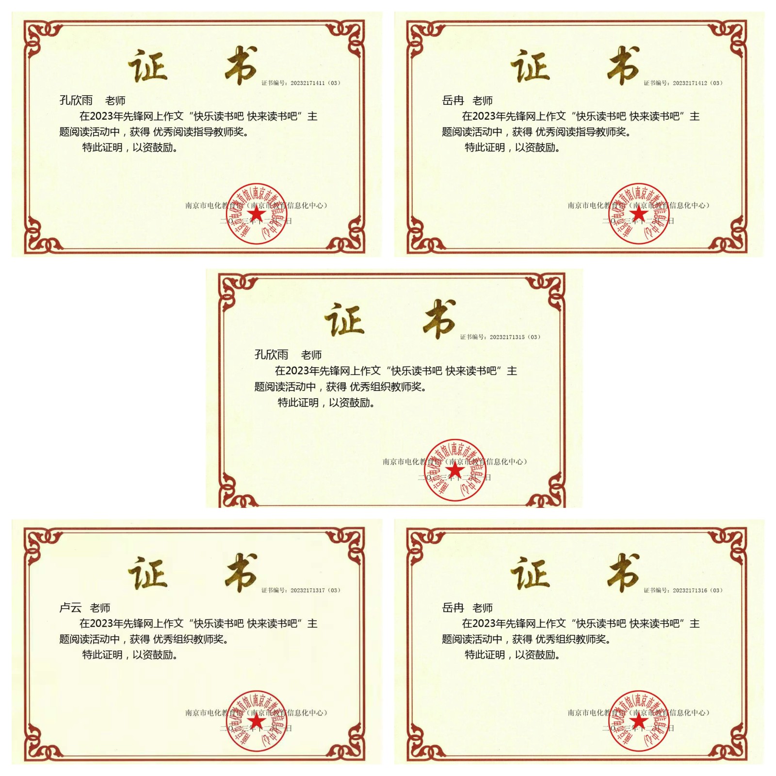 在南京市电化教育馆(南京市教育信息化中心)组织的2023年先锋网上作文“快乐读书吧 快来读书吧”主题阅读活动“我爱阅读打卡”和“我会阅读策略”活动中,我校共12名学生获奖,孔欣雨和岳冉老师获优秀阅读指导教师;孔欣雨、岳冉、卢云老师获优秀组织教师。获奖证书如下: